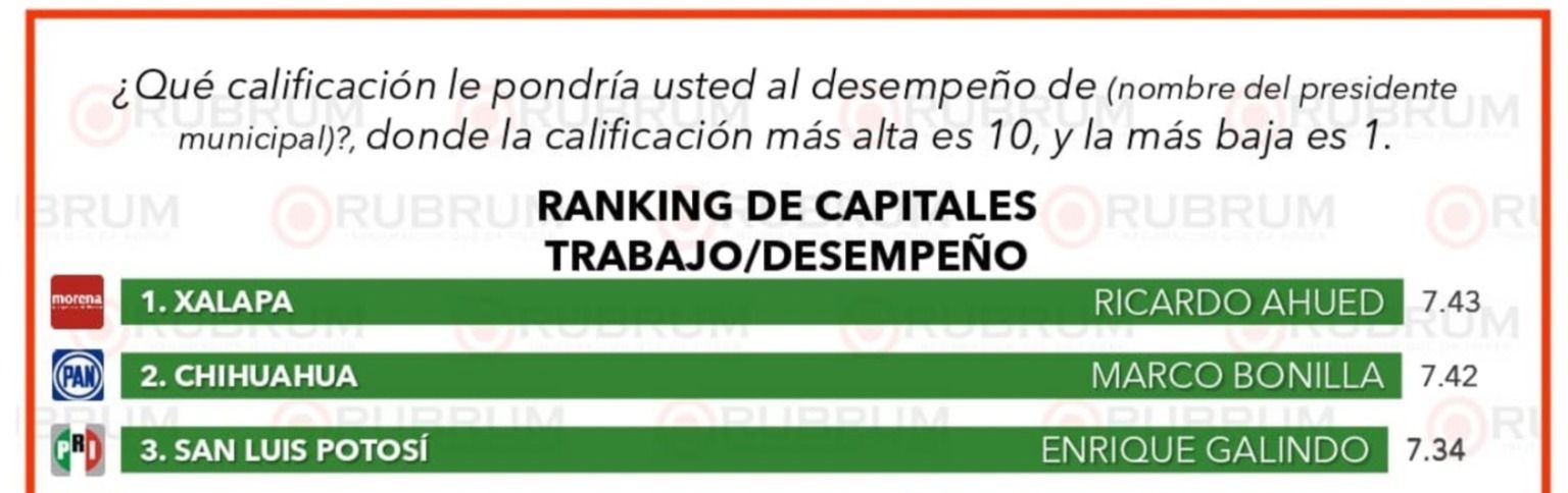En el estudio de opinión, Galindo Ceballos solamente es superado por Ricardo Ahued, de Xalapa, Veracruz, con 7.43 puntos y Marco Bonilla, de Chihuahua, Chihuahua, con 7.4 puntos.